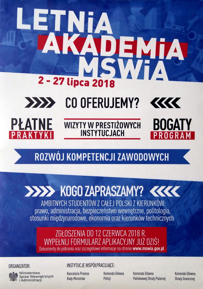 Ministerstwo Spraw Wewnętrznych i Administracji ogłosiło nabór kandydatów na miesięczne, płatne praktyki zawodowe w ramach programu „LETNIA AKADEMIA MSWiA”. Dzięki programowi najlepsi studenci z całej Polski będą mogli zdobyć nowe kompetencje, poszerzyć swoją wiedzę i poznać funkcjonowanie administracji publicznej.