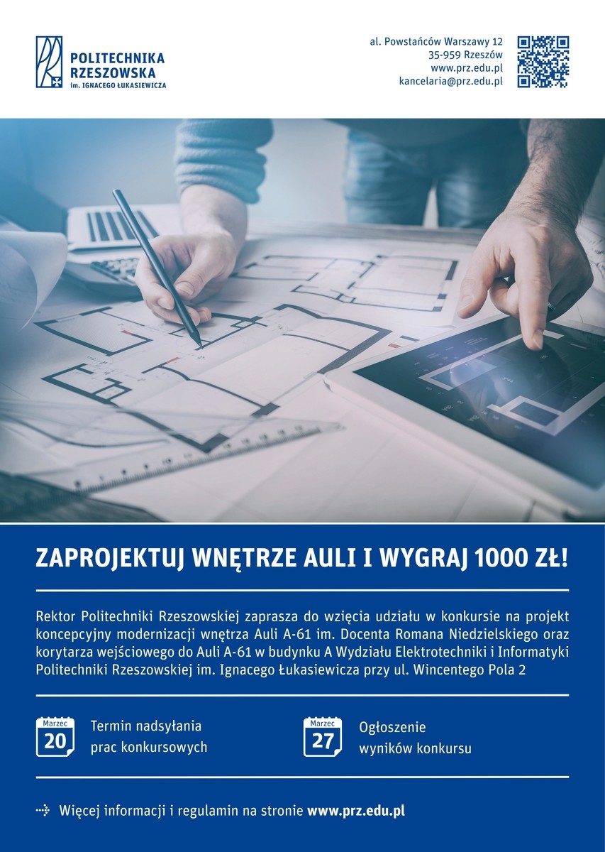 Zachęcamy do wzięcia udziału w organizowanym przez rektora Politechniki Rzeszowskiej konkursie na projekt koncepcyjny modernizacji Auli A-61 im. Docenta Romana Niedzielskiego oraz korytarza wejściowego do Auli A-61 w budynku A Wydziału Elektrotechniki i Informatyki Politechniki Rzeszowskiej im. Ignacego Łukasiewicza przy ul. Wincentego Pola 2.